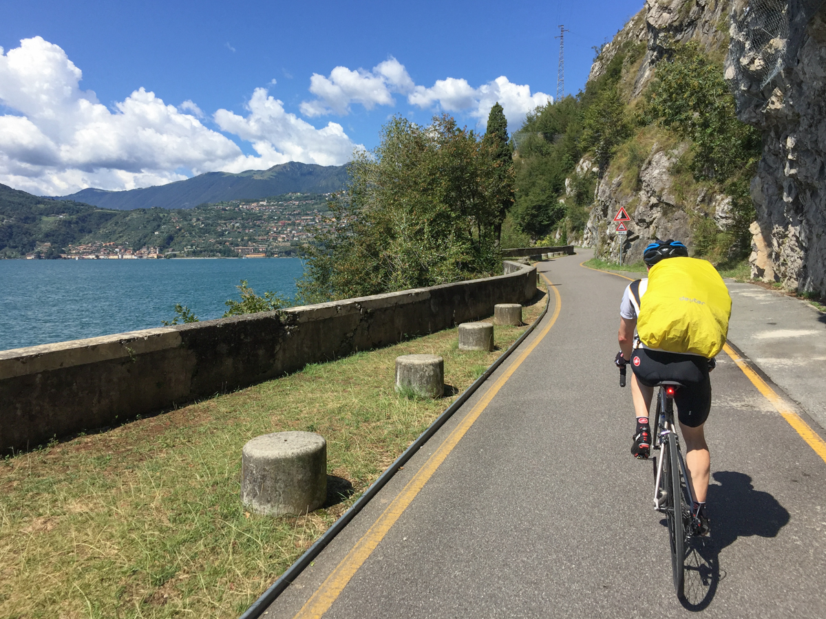 Auf Regen folgt Sonnenbrand. Als wir mittags den vielleicht schönsten Radweg Europas genießen durfte, hatten wir schon den Trainingspass der Lombarden in den Beinen. Auch die Abfahrt vom Passo de Tre Termini runter zum Lago d‘Iseo ist kaum zu überbieten. Die letzten Schwimmer der alljährlichen Lago-Durchquerung kamen gemeinsam mit uns ans Ufer. Wir zollten ehrlichen Applaus und dachten: Die haben doch ein Rad ab, diese Ausdauersportler! Dann schob uns der Wind weiter hinein in die Berge. Erst entlang des Lago. Dann tiefer rein ins breite Tal des Oglio. Zum Sportlichen: Mein Ein-Mann-Gruppetto feierte Wiederauferstehung. Für die Nicht-Profis: Im Gruppetto versammeln sich bei großen Rundfahrten diejenigen Fahrer, die bei Bergetappen nur ein Ziel haben: gerade noch innerhalb der erlaubten Zeit anzukommen. Während die britische 57-kg-Bergziege locker den zweiten Anstieg hochwippte, ächzte mein 85-kg-Gruppetto auf den letzten Körnern nach Borno. Gegen die Briten ist auf Rundfahrten eh nichts zu machen. Ich fürchtete fast, Martin hatte schon ein 3-Gänge-Menue verdrückt, bevor ich endlich auf 1000 Höhenmetern erschien. Bei den vier Kugeln Eis war ich aber schneller. Ein Schluck für 4 Kugeln ist auch kaum zu toppen.