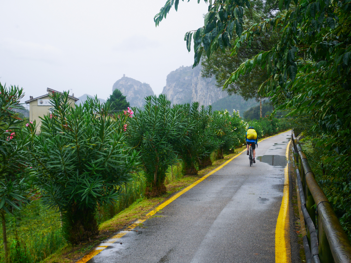 Ein paar Kilometer durften wir auf dem verträumten Radweg gondeln, dann ging’s rein in den zähfließenden Verkehr am schnöden Gardasee entlang. Ich bin vor kurzem von einer Joggerin gefragt worden, was man so denkt beim Radfahren. Nun, so meditativ wie das Joggen ist es nicht. Wichtigster Unterschied: Man steckt voll im Verkehr und sollte hübsch aufpassen, was die anderen Verkehrsteilnehmer treiben. Außerdem muss man schalten, das gibt’s beim Joggen auch nicht. Ferner geht alles schneller. Wenn man nicht bei jedem Feldweg aus dem Tritt kommen will, sollte man schon vorher wissen, wo es bei der nächsten Biegung lang geht. Im Reisebustempo zogen wir am trüben See entlang. In den Orten haben manche Bars Techno-Ufftata aufgedreht, so schlimm, dass es die Beine noch zusätzlich beschleunigt. Los ist trotzdem nix. Überall werden Sachen mit Aqua vornedran beworben. Aquadromo, Acquaterme, Aquagarda… Dabei muss man nur Radfahren, dann kommt das Wasser von allen Seiten. Von oben sowieso, aber auch von unten. Während mein Rouleurantrieb auf Touren kommt, denke ich zu den eben beschriebenen Gedanken noch folgendes: Dass es ein lustiges Gefühl zwischen den Zehen ist, wenn man sie im Schuh runterdrückt, wobei das Wasser zwischen den Zehen hochquillt. Meine Maschine macht erstaunliche 35 Sachen flach. Wie einst Fabian Cancallara, denke ich. Aber nur so lange bis ein leichter Hügel kommt. Den fahr ich wieder so dynamisch hoch wie Rainer Calmund. Wie gut, dass heute wenig Hügel kommen.