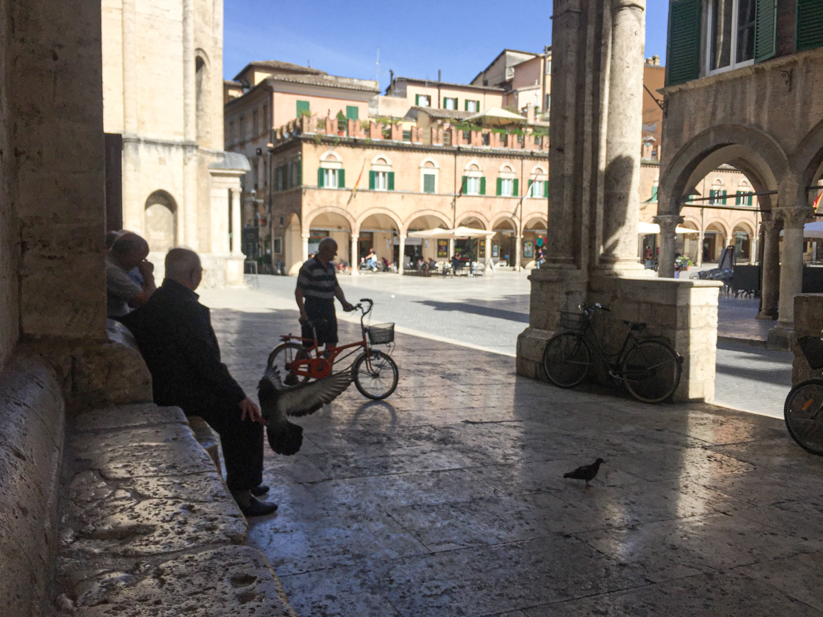 Der alte Herr auf dem Klapprad hätte mich heute morgen leicht überholt. Trotz Ruhetag war mein Antrieb total im Eimer. Da ging es nicht um Kleinigkeiten wie Rasur. Sondern um den Inhalt. Was ich spürte war so flexibel wie armierter Beton. Schon als ich vom Frühstück die Stufen hoch aufs Zimmer ging, wußte ich, dass es kein Tag für Helden wird. Am dritten Tag und in der dritten Woche, sagt man bei Rundfahrten, sei es am schlimmsten. Dagegen war mein dritter Tag noch Zucker. Also Wellnessradeln. Freude am Fahren unter widrigen Bedingungen. Treten, damit es wieder besser geht. Ich hatte die Wahl zwischen Mittelgebirge und öder Adria. Keine Frage. An der Adria schob die Luft leicht anlandig. Nie war Rückenwind so wertvoll wie heute. Tatsächlich erspähte ich einen RennradSenior, der in meine Richtung bummelte. Genau mein Tempo. Außerdem bog er so zielstrebig um die Ecken, dass ich von seiner Orts- und Radwegkenntnis profitierte. Zu meinem eigenen Erstaunen kam im Laufe der Etappe mein Ein-Mann-Gruppetto wieder auf Touren. Plötzlich war der richtige Schnitt auf der Ebene wieder da. Ich bog ab ins Inland. Ziel Ascoli Piceno. Famose Stadt vor beeindruckender Kulisse. Unten Bruthitze. Im Hintergrund noch schneebedeckte Gipfel. Morgen früh wird’s spannend. Trau ich mich hoch in die Abruzzen – oder besser nicht. Nach dem Frühstück nochmal genau hören, was die Beine flüstern. Erkenntnis des Tages: Je älter die Fahrer, desto bunter das Trikot.
