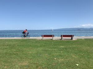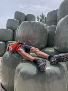 Spritztour (Etappe 2) Sigmaringendorf – Teufen Können die Schweizer noch so hohe Berge haben, wir Schwaben haben den Höchsten. So heißt der oberschwäbische Höhenzug, der am Vormittag auf der Speisekarte stand. Am bereitgestellten Bänkle des Uphill Freundeskreises fanden wir uns in würdiger Gesellschaft zweier RadfahrerInnen. Eine vortreffliche Einheimische, Figur Deutsche