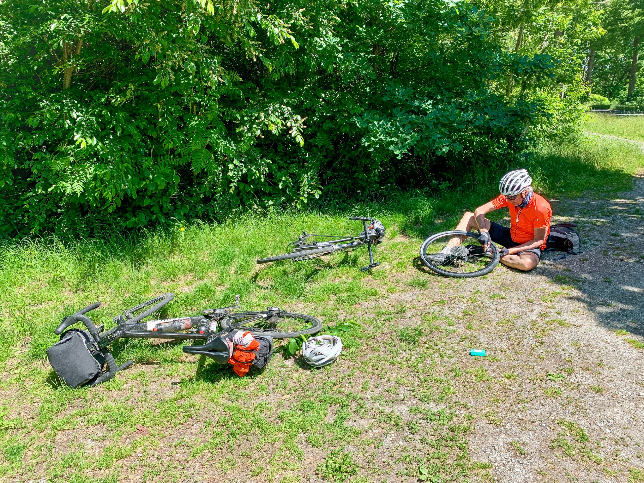 Nein, das sind nicht die Bilder, die man von uns sehen will: Die windschlüpfrigen jungen Männer am Straßenrand bei der Flickschusterei. Hatte ja vor der Reise ein wenig Bammel ausgerechnet in Pirna hängen zu bleiben. Weil kein Antinazispray dabei. Das kommt von den Vorurteilen: Wir wären fast schon vor Pirna hängen geblieben. Während halb Deutschland launige Pfingstmontagsausflüge unternimmt, verbringen wir Stund um Stund dort am Straßenrand, wo der Schlauch seine Luft fahren lässt. Auch der Ersatzschlauch hat Launen. Aber der Michl am Abend zur Höchstform aufgelaufen. Erst in einer Minute den megaengen Mantel auf die Felge geworfen (beim vierten Mal an diesem Tag bestens geübt) und dann pfeilschnelle 25 Schlusskilometer gestrampelt, um die letzte Bestellung im Hotelrestaurant zu erwischen. Sonst eher so guckhierguckda, der Michl. Aber wenn’s um die Essensbestellung geht: Motivatione maximale. Voll fokussiert. Als die tschechische Biergartenkraft allerdings mitteilte, dass „keine Bestellung mehr“, weil zwei nach Achte, ich am Rande eines spätnachrichtenfähigen Kapitalverbrechens. Gut, dass jemand fünf Minuten später auf die Idee kam, uns mitzuteilen, dass nur der Biergarten dicht macht und man drin im Restaurant noch was bekommt. Geht doch.