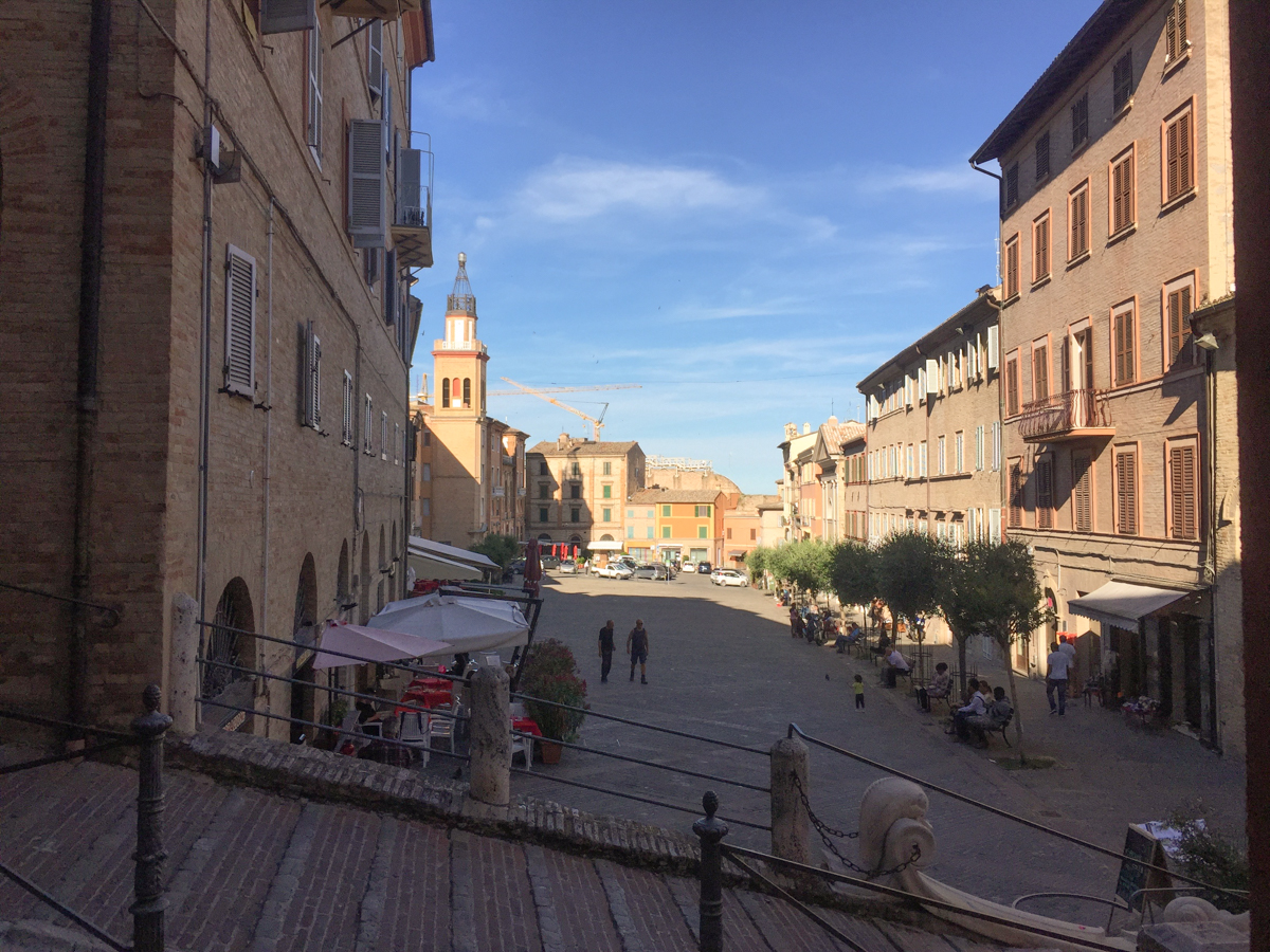 Die Entscheidung für den spontanen Ruhetag verdanke ich auch Macerata. Von dem Flecken hatte ich zuvor noch nie gehört. Was in meinem Fall auch daran liegen mag, dass der örtliche Fußballklub nur eine Saison in der Serie B spielte, und zwar noch vor dem Weltkrieg. Aber der Flecken lag eben günstig auf der Route. Welch Überraschung! Die Stadt erstreckt sich wundervoll über einen langen Hügel. Für die Insider: Perugia geschrumpft. Innerhalb der riesigen Mauern sind so viele Caffebars und Osterien, die kann man in einem Tag gar nicht alle probesitzen. Macerata verhält sich zu Ancona wie Tübingen zu Stuttgart. Buchhandlungen und Copyshops überall. Die Fakultäten der Uni verteilen sich gleichmäßig über die Stadt. Die Studentinnen auch. Als einziger Touri versuche mich harmonisch ins Stadtbild einzufügen, versage allerdings schon beim Bartwuchs. Ein Besuch beim Barbiere unterhält mich den halben Vormittag. Als schnöder Trockenrasierer lerne ich, wie lang der Profi einschäumt. Die Waden… ach, ich bin doch kein Poser. Mit dieser Haltung bleibe ich dann doch ein Unicum unter den hiesigen Rennradstramplern. So viel Widerstand muss sein. Erkenntnis des Tages: Radfahren ist klasse. Geht aber auch ohne.