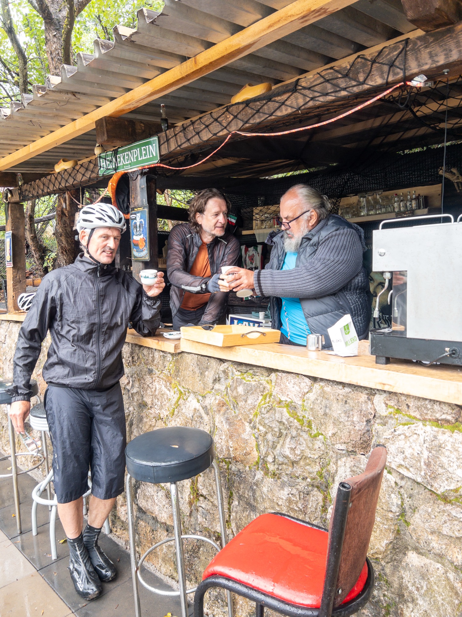 Sogar der Fritz ist jetzt mürbe, am Ende dieser harmlosen Etappe. Kennt ihr den ikonischen Cartoon von Charlie Brown, auf dem er allein auf dem Schlaghügel steht mit einer Regenwolke über ihm? So sind wir heute dagestanden. Über dem gesamten Balkan kaum eine Wolke. Außer über uns. Viermal sind wir losgefahren. Und viermal hat‘s die Wolke gemerkt. Die hat sich kaputt gelacht über uns. Holzstadel, Vordach, Anarcho-Bar, Bushaltestelle – überall sind wir heute rumgestanden. Und ein paar Kilometer gefahren. Und wieder rumgestanden. Am lustigsten war natürlich die Bar. Drei Stehtische am Straßenrand, ein Kiosk-ähnlicher Verschlag aus den Country-Blues rausdröhnte, mehrere Flaschen angebrochener Schnaps, halber Kasten Bier, eine Kaffeemaschine, merkwürdige Deko, eher Harley-Style, ein einziges Chaos hinterm Tresen. Keine Menschenseele weit und breit. Niemand. Zugegeben, es goss in Kübeln. Eigentlich ein Wetter, bei dem du keinen Radler vor die Tür jagst. Wer soll da schon kommen? Als Barista kannst du dich da schon verzupfen. Wir also hinter den Tresen, weil‘s nur da trocken war. Praktisch mitten im Chaos. Und siehe da. Nach ner halben Stunde erscheint der Chef. Großes Hallo. Chef gleich an die Kaffeemaschine. Amtlicher Espresso. Der Chef leider nicht gut in Englisch oder Deutsch. Aber Holländisch-flämisch-Deutsch ging. Weil er während des Bosnien-Krieges in den Niederlanden Zuflucht gefunden hatte und seine Tochter bis heute dort lebt. Bißle schräg, der Herr, das gehört dazu bei interessanten Leuten. Ökonomie hat er studiert sagt er, und mit dem Zustand der Welt ist er nicht verstanden. „Tschigaretten, 26 Euro, Diktatüüür“, schimpft der Chef. Allerdings bin ich mir nicht sicher, ob man zur Ungleichverteilung des Wohlstand unbedingt den Preis der Rauchwaren hernehmen sollte. Egal. „Diktatüüür“, meckert er weiter, noch ein paarmal und erklärt uns einige Minuten lang, was alles falsch läuft in der Weltwirtschaft. Ein paar seiner Gedanken würd ich nicht unbedingt unterschreiben. Aber egal. Nicht die beste Idee, auf semi-flämisch an einer bosnischen Landstraße bei Regen in eine wirtschaftspolitische Grundsatzdiskussion einzusteigen. Also lassen wir das. Wie zur Bestätigung scheint plötzlich die Sonne. Also weiter, zumindest so lange, bis uns die Wolke wieder eingeholt. Keine paar Meter später halten wir an einem freundlichen Restaurant. Sonne scheint. Der Besitzer ist sowas von servicebeflissen, dass es längst zu viel ist. Wir speisen fein. Der Besitzer scheint gleich noch ein paar „Super“ hinterher. Sein Restaurant heißt „Good times“ Englisch kann er kaum. Außer „super, super, super“. Seine Rechnung ist auch super für ihn. Ich würde schätzen, dass er sich relativ gut mit den ökonomischen Rahmenbedingungen auseinander gesetzt hat.