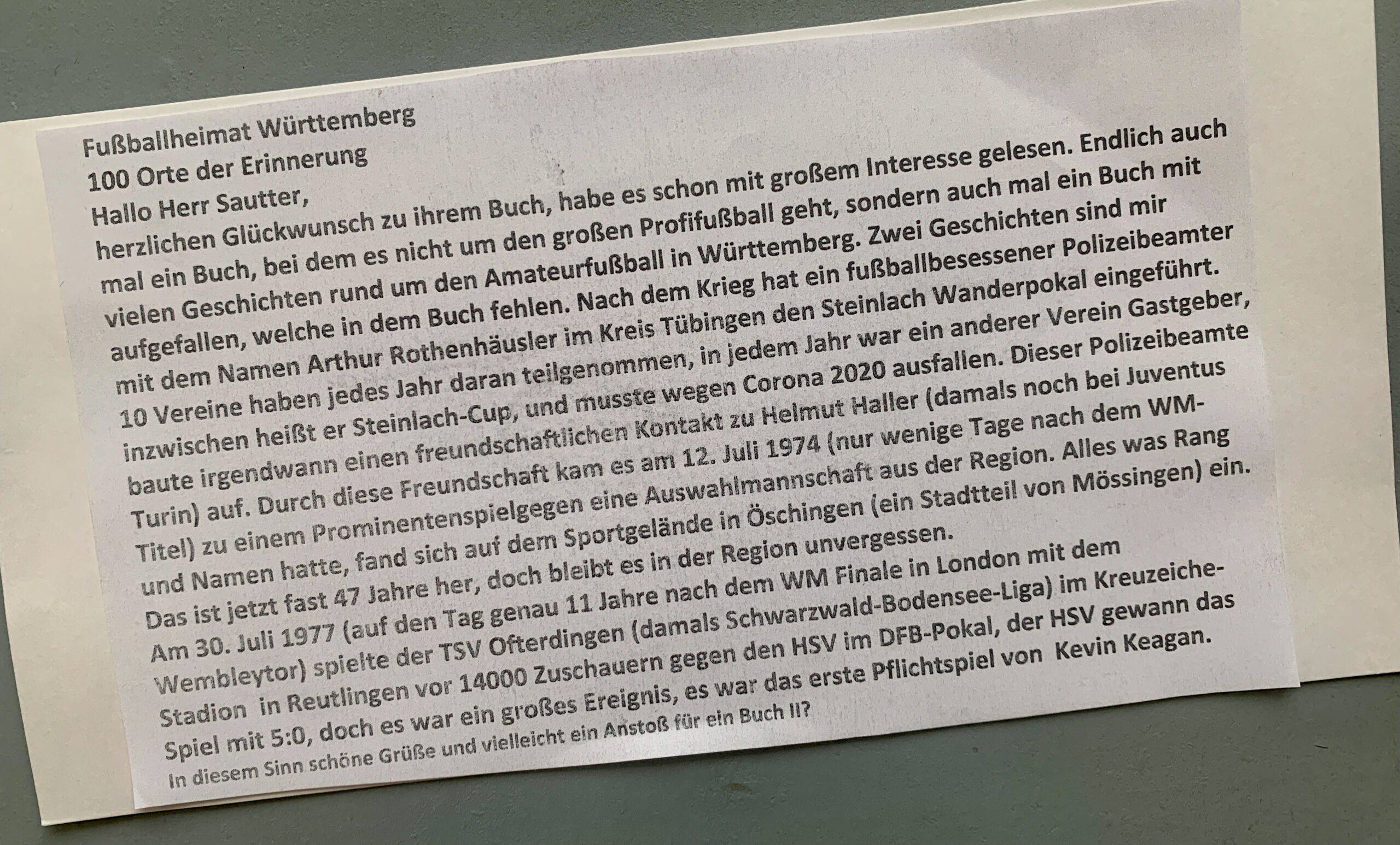 „Herzlichen Glückwunsch zu ihrem Buch, ich habe es mit großem Interesse gelesen. Endlich mal auch ein Buch, bei dem es nicht nur um den großen Profi-Fußball geht, sondern auch mal ein Buch mit vielen Geschichten rund um den Amateurfußball in Württemberg. Zwei Geschichten sind mir aufgefallen, welche in dem Buch fehlen. Nach dem Krieg hat ein fußballbessessener Polizeibeamter mit dem Namen Arthur Rothenbühler im Kreis Tübingen den Steinlach Wanderpokal eingeführt….“