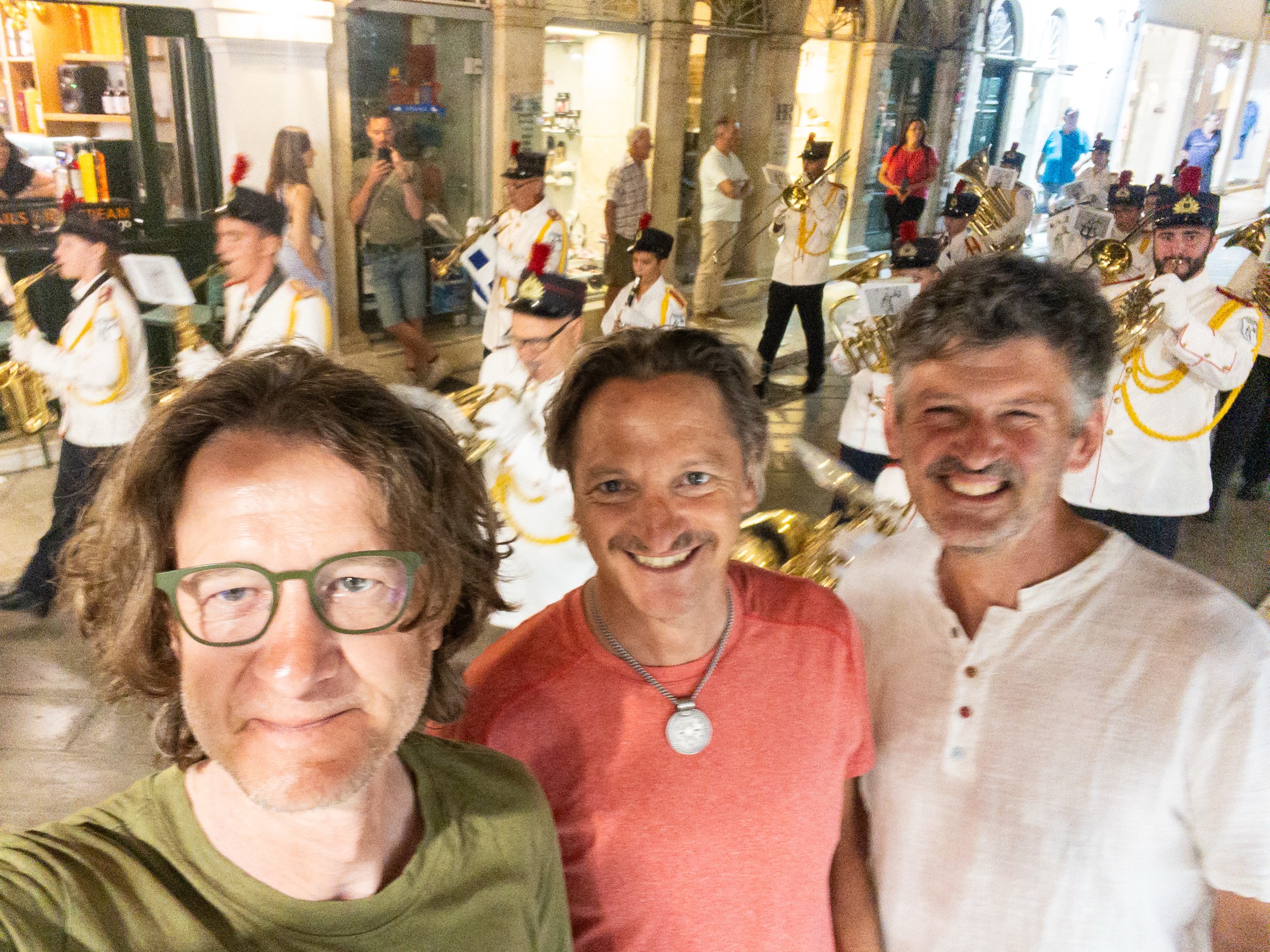 Du kannst nicht behaupten, dass uns Korfu nicht würdig empfangen hätte. Auf der Insel gibt‘s achtzehn Musikvereine. Die Blasmusik-Tradition reicht fast 200 Jahre zurück. Heute war es uns vorbehalten, die große Parade der korfiotischen Kapellen abzunehmen. Gern geschehen. Die stolzen Orchester auf Füßen defilierten an uns vorbei. Mit letzten Kräften nahmen wir Haltung an. Mehr Tamtam muss echt nicht sein. Wir sind balkanplatt, im Sinne von tief beeindruckt.