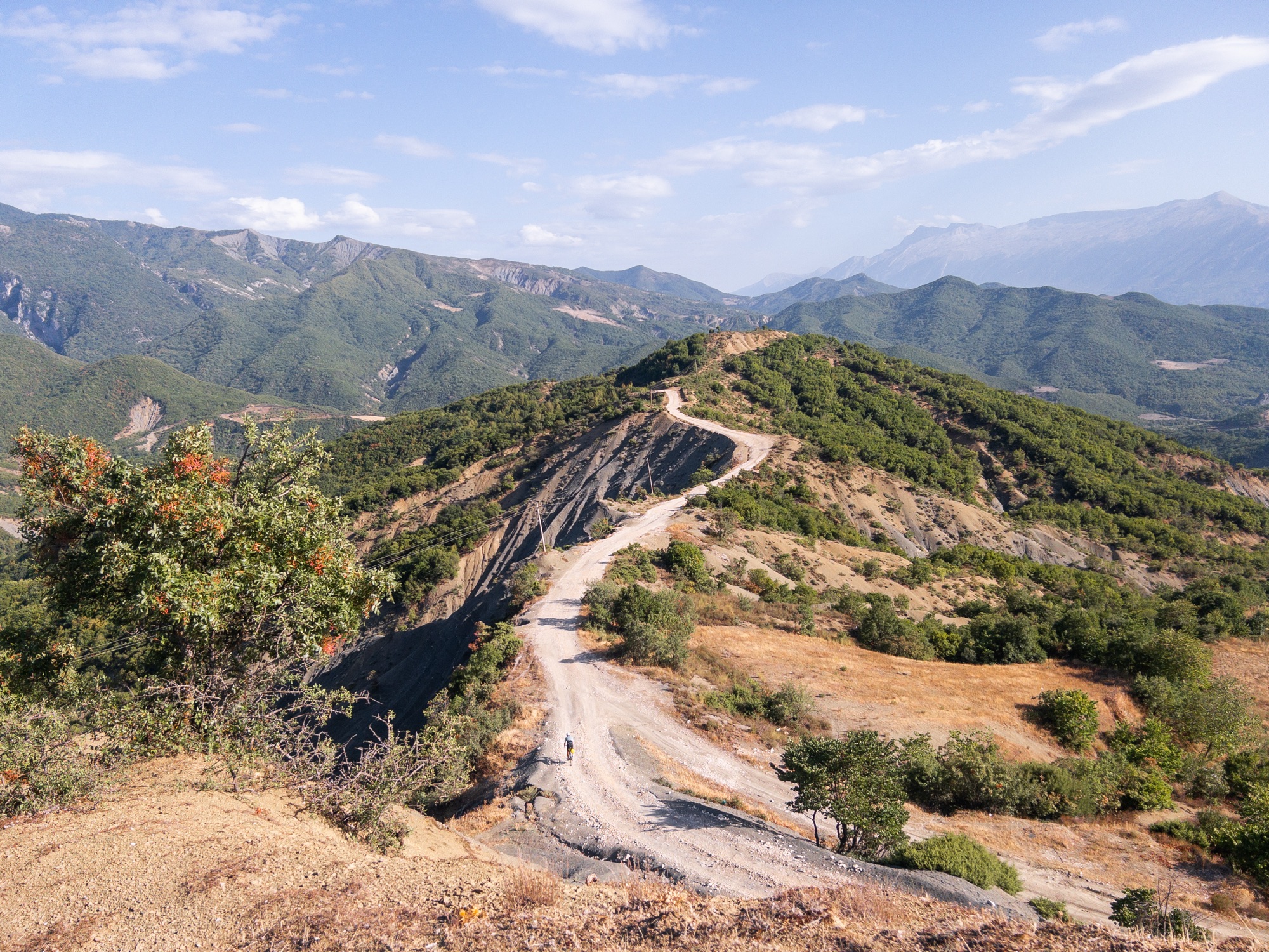 Was du da oben siehst, rund 900 Meter über Normalnull, ist nicht mehr normal. Majestätische Perspektiven über unberührte Landschaft. Da denkst du fast, du wärst ein Vogël, und zwar kein kleiner. Da hat der Fritz seine fehlenden Gänge vergessen, ich meine brennenden Waden und der Floff fast seinen Respekt vor dem Downhill. Aber nur fast. Respekt brauchst du nämlich, der schützt dich, damit du nicht übermütig wirst, wenn dich die dicken Brocken auf den Weg hin und her werfen. Kurz bevor wir auf die Straße kommen, noch den ersten Balkanplatten der Reise. War ja klar, es erwischt den, der auf diesen Namen gekommen ist. Keine Ursache.