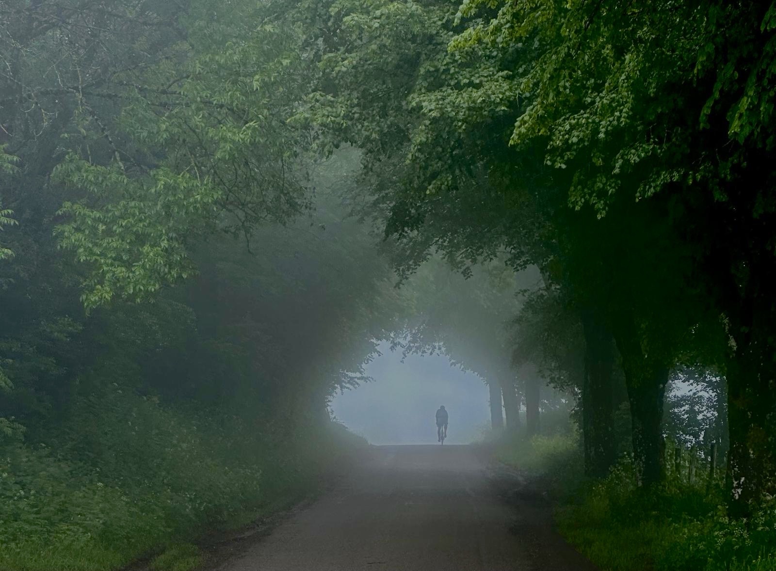 Hundert Kilometer quer durch den französischen Jura und nichts zu erzählen? Ja, das kann vorkommen. Hier ist halt wenig bis nichts. Auf den Landstraßen kommt vielleicht alle 10 Minuten ein Auto. Meistens ein Milchlaster. Und wie der die Kurven schneidet. Der weiß, dass außer ihm grad keine Menschenseele hier ist. Total schöne Gegend, dort wo der Jura noch nicht so hoch reicht. Also vermutlich. Denn viel gesehen haben wir nicht. Blickweite vielleicht fünfzig Meter. Auch mal schön. Nicht mal Dörfer. Das erste erreichten wir nach ungefähr 30 Kilometer. Vorher tauchte vielleicht ein einzelner Hof aus dem Nebel auf, sonst nichts. Nicht mal Wanderwege sind angelegt. Also auch keine Wandersleute, die die Ruhe stören. Einfach friedliches Nichts. Fürs Fotografieren allerdings super. Du kannst hinknipsen, wo du willst, und es sieht meistens aus wie ein Bild von Casper David Friedrich. Das hat natürlich den strampelnden Künstler auf den Plan gerufen. Endlich mal Urlaubsfotos ohne Sonnenschein. Das Netz ist ja voll von Sonnenschein. Dauernd scheint überall die Sonne. Im Jura kannst du knipsen, wie Casper David Friedrich gemalt hat. Also so, wie es influenten Netz kaum zu sehen ist. Macht nur keiner, weil ja – siehe oben – kaum einer hier.