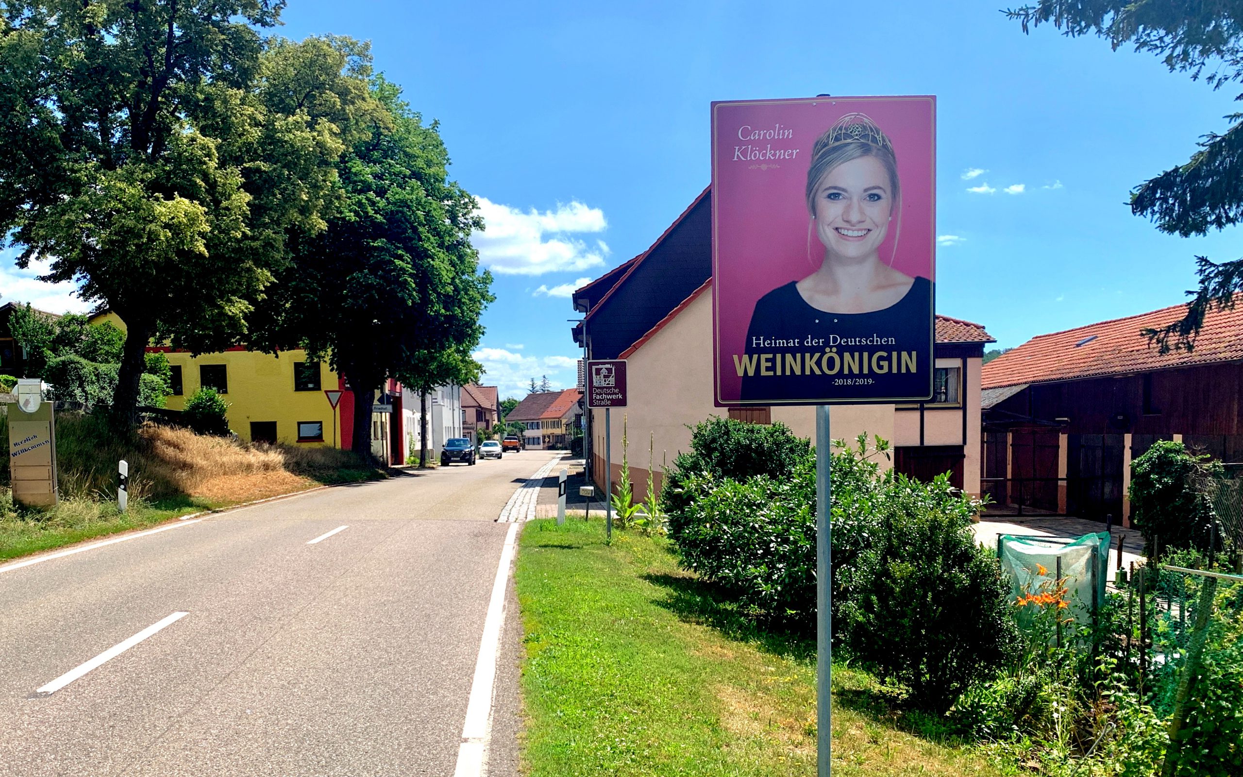 Habe die gute alte Heimat in die erste Etappe eingebaut. Der Besuch bei den Eltern in Aurich, wie immer vorzügliche Nährstoffe dort. Schwäbisch währt am längsten. Mit gefüllten Speichern über Stromberg und Heuchelberg hinweg ins Kraichgau. Aber halt! Muss noch was zu Gündelbach loswerden. Das liegt tief vergraben zwischen zwei Höhenzügen. Auch dort Weinberge, dort scheint die Sonne so grad noch hin. Ob unten im Dorf je ein Lichtstrahl gelandet ist, da waren wir uns schon früher unsicher. Wenn du in reinfährst, begrüßt dich per Plakat die Deutsche Weinkönigin in der Version 18/19. Mit Namen Carolin Klöckner, Gündelbacherin. Jetzt echt: Da wächst eine nach. Als ob die unsägliche Julia, deutsche Weinkönigin der Amtszeit 95/96 nicht genug wäre. Die nächste grinsende Klöcknerin mit identischer Qualifikation kommt aus dem Stromberg. Aufgewachsen ohne Licht. Plakat kann sie schon mal. Reicht ja, sagen viele.